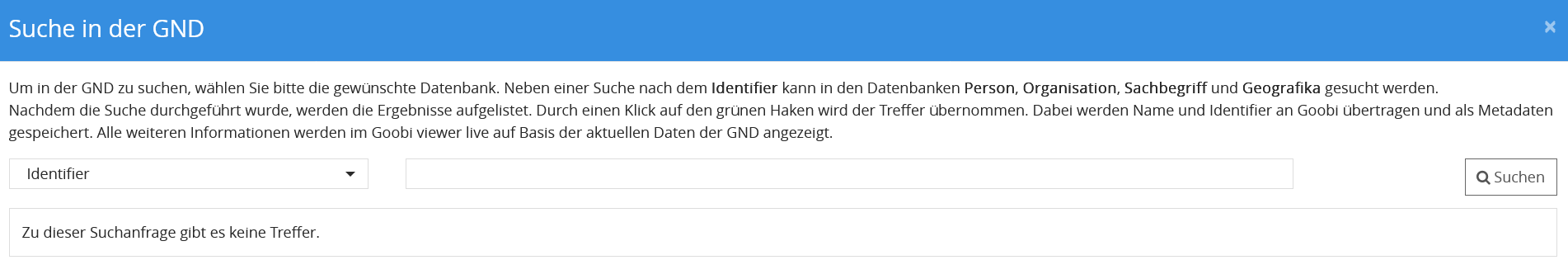 Seit einger Zeit funktioniert diese Methode jedoch nicht mehr. Die Suche zeigt immer “Null Treffer” an. Ebenso verhält es sich bei der VIAF. Wir nutzen Version 24.09.9 von Goobi workflow.