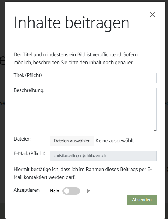 Jede:r registrierte User hat einen Menüpunkt “Inhalte beitragen” mit folgendem Eingabeformular: